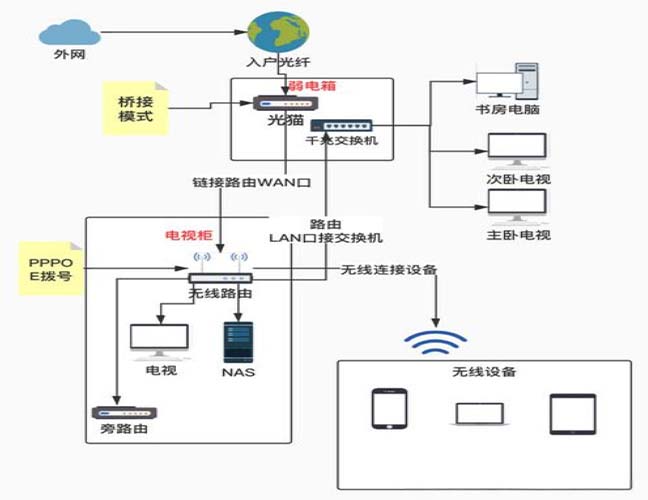 家庭网络稳定性的关键:光纤接入弱电箱,但汇聚节点应设在客厅以避免信号屏蔽。布线时需为IPTV和路由器预留专线,推荐六类网线保障千兆速度。组网可选路由器、AC+AP或mesh方案,mesh自组网稳定性更优.光纤通常连接到弱电箱,这一步对于确保家庭网络的稳定性和后续维护的便捷性至关重要...